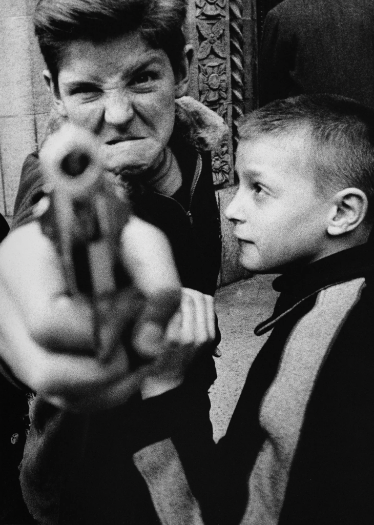 Si parla sempre della grana. Pellicola ad alta sensibilità, stampa forzata, contrasto bruciato fino a due toni, nero e bianco, come un quadro di Franz Kline. Tutta roba tecnica che non spiega niente di quello che succede davvero in queste fotografie. Anche perché una parte di quella grana non è cercata. Klein sviluppa e stampa di notte, negli uffici di Vogue, trasforma gli errori di esposizione e di messa a fuoco in dispositivi espressivi, ma a posteriori. Non è un’estetica. È un incidente promosso a linguaggio.Klein fotografa a una distanza che nel 1954 non esiste. Un grandangolo sulla Leica che lo obbliga a stare a meno di un metro dal soggetto. A quella distanza non scegli cosa inquadrare. Ti prendi in faccia quello che c’è. I ragazzini con le pistole giocattolo, il bambino in primo piano, espressione contratta, arma puntata dritta in macchina, la lente che gli dilata la mano fino a renderla enorme: non è un ritratto. Non è nemmeno street photography, qualunque cosa significhi. È il documento di una collisione tra due corpi nello spazio. Mi irrita che questo non venga detto con chiarezza. La fotografia umanista europea poggiava su un patto: il fotografo vede senza essere visto. Cartier-Bresson si paragonava a un arciere zen. Klein si pianta lì e le espressioni che cattura (stupore, sfida) sono reazioni a lui. Non preesistono allo scatto. Lo scatto le provoca. Ogni immagine di New York contiene il peso di chi la sta facendo.